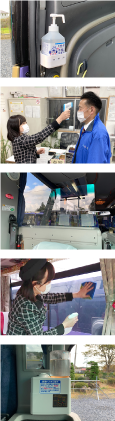 待機時と運行終了時には、アルコール消毒液を使用し、車内の除菌と清掃を徹底しております。また、次亜塩素酸水溶液を噴霧し空間除菌を実施しております。