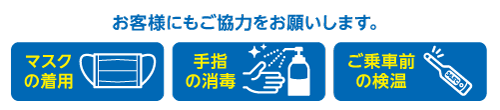 全従業員に対して、出勤前の検温を実施し、発熱などかぜに似た症状がある場合は、出勤を見合わせることにしております。また乗務員には、点呼時に改めて検温をし、健康状態の確認を行い、異常が見られた場合は乗務を見合わせます。 -